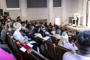 Blick in einen gut gefüllten Hörsaal. Am Rednerpult ist schemenhaft ein Redner zu sehen.