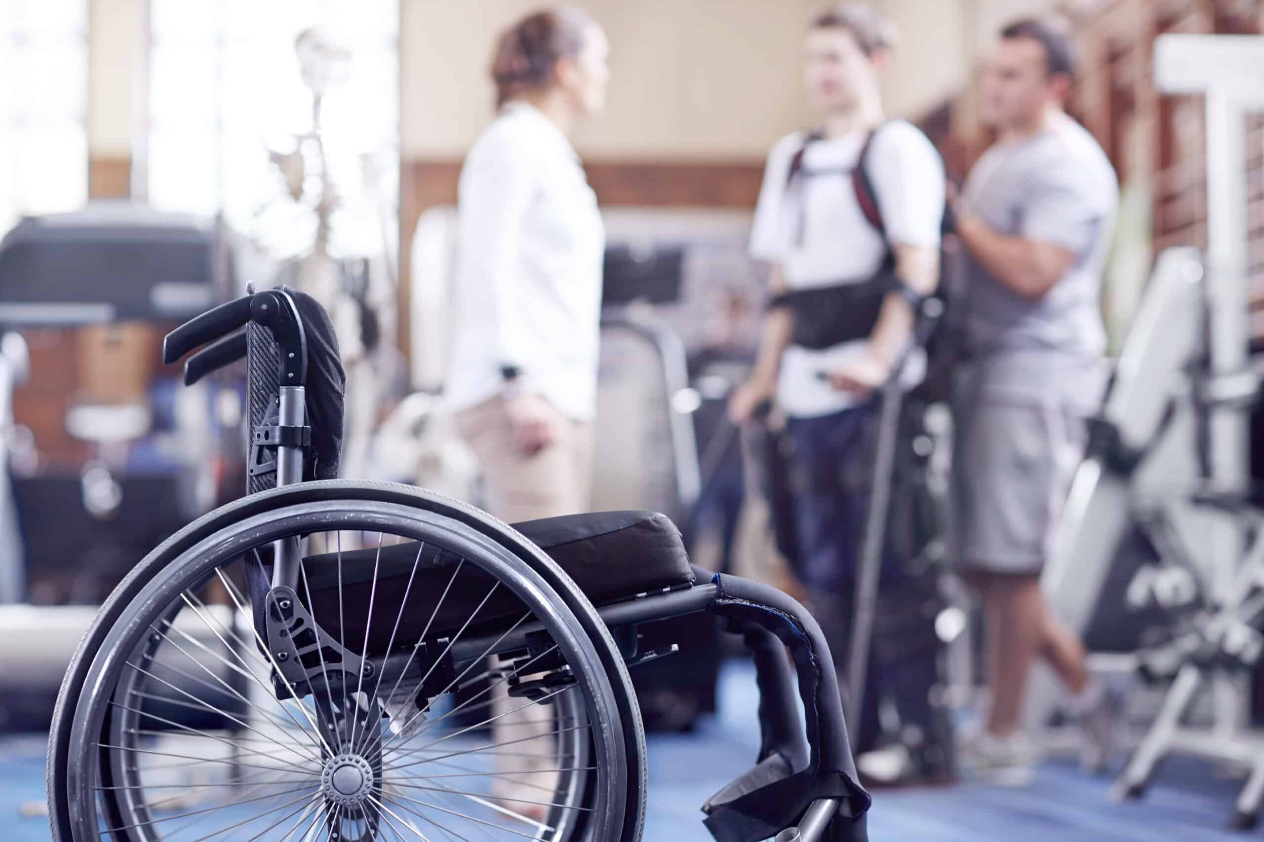 Auf dem Bild ist eine Situation in einer Rehaklinik zu sehen. Im Vordergund steht ein Rollstuhl und im Hintergrund drei Personen. Eine Person trägt ein unterstützendes Korsett und Unterarmstützen.